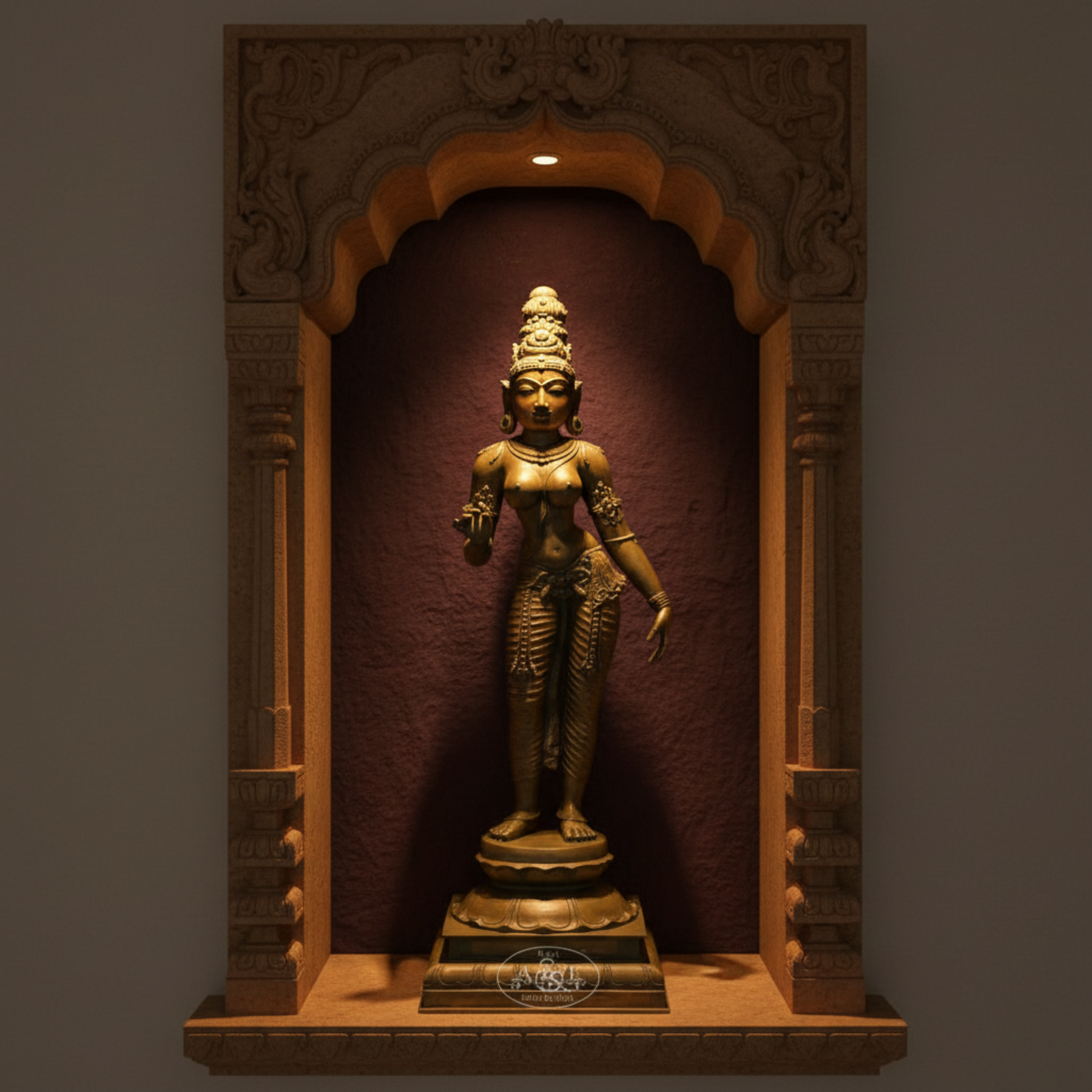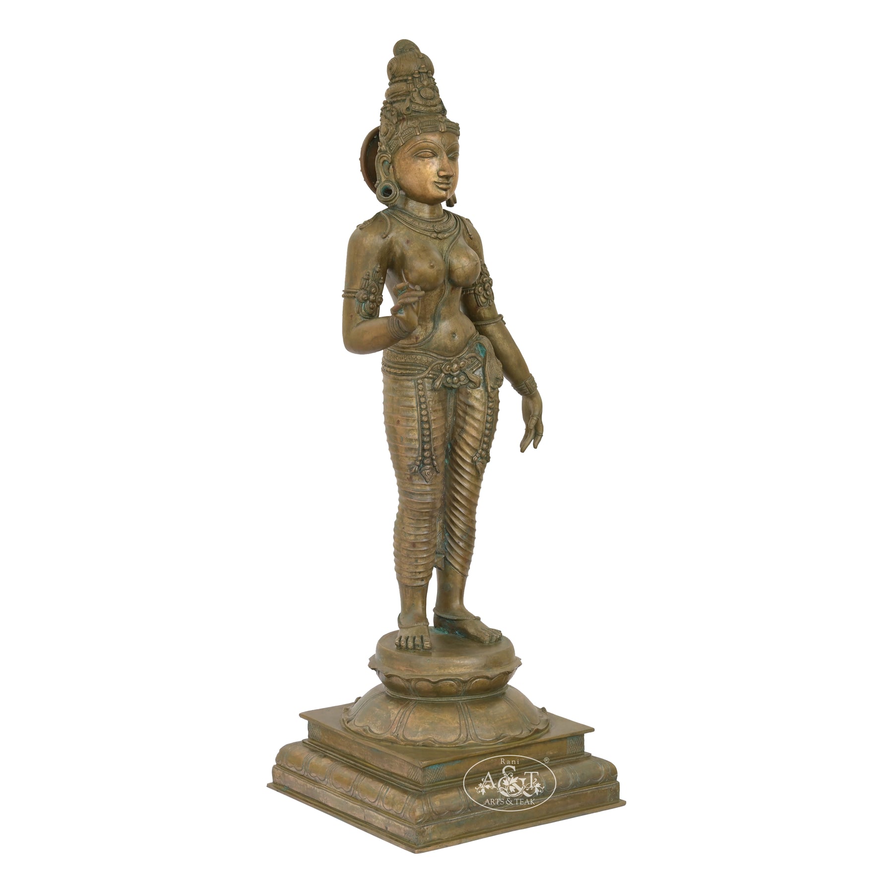 Sivagami sculpture captures the timeless elegance of the Chola period, embodying the goddess Parvati’s essence as the symbol of love, fertility, and devotion. Expertly crafted with attention to her distinctive mudras, the piece reflects qualities of fearlessness and deep spiritual commitment, making it a refined addition to any collection seeking cultural and artistic sophistication.