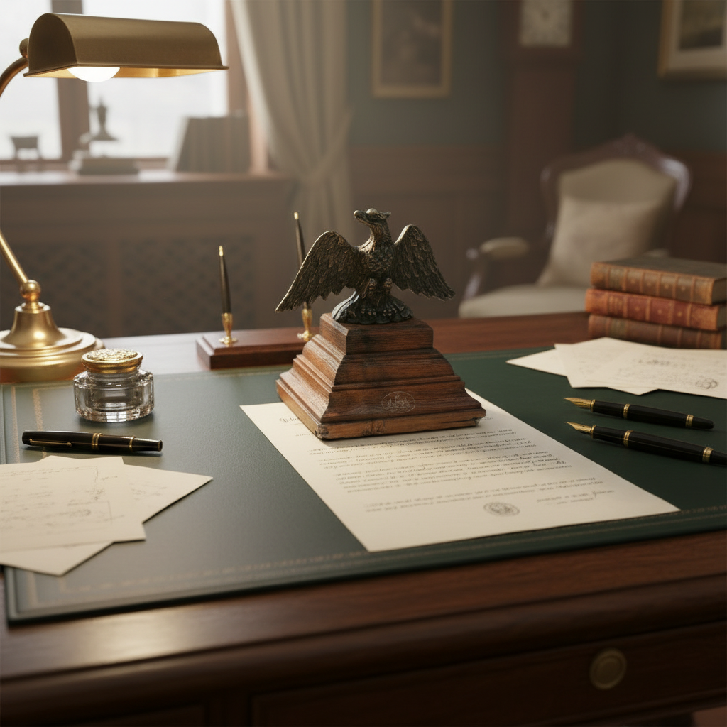 Decorative eagle statue on a wooden base with stationery items on a desk.