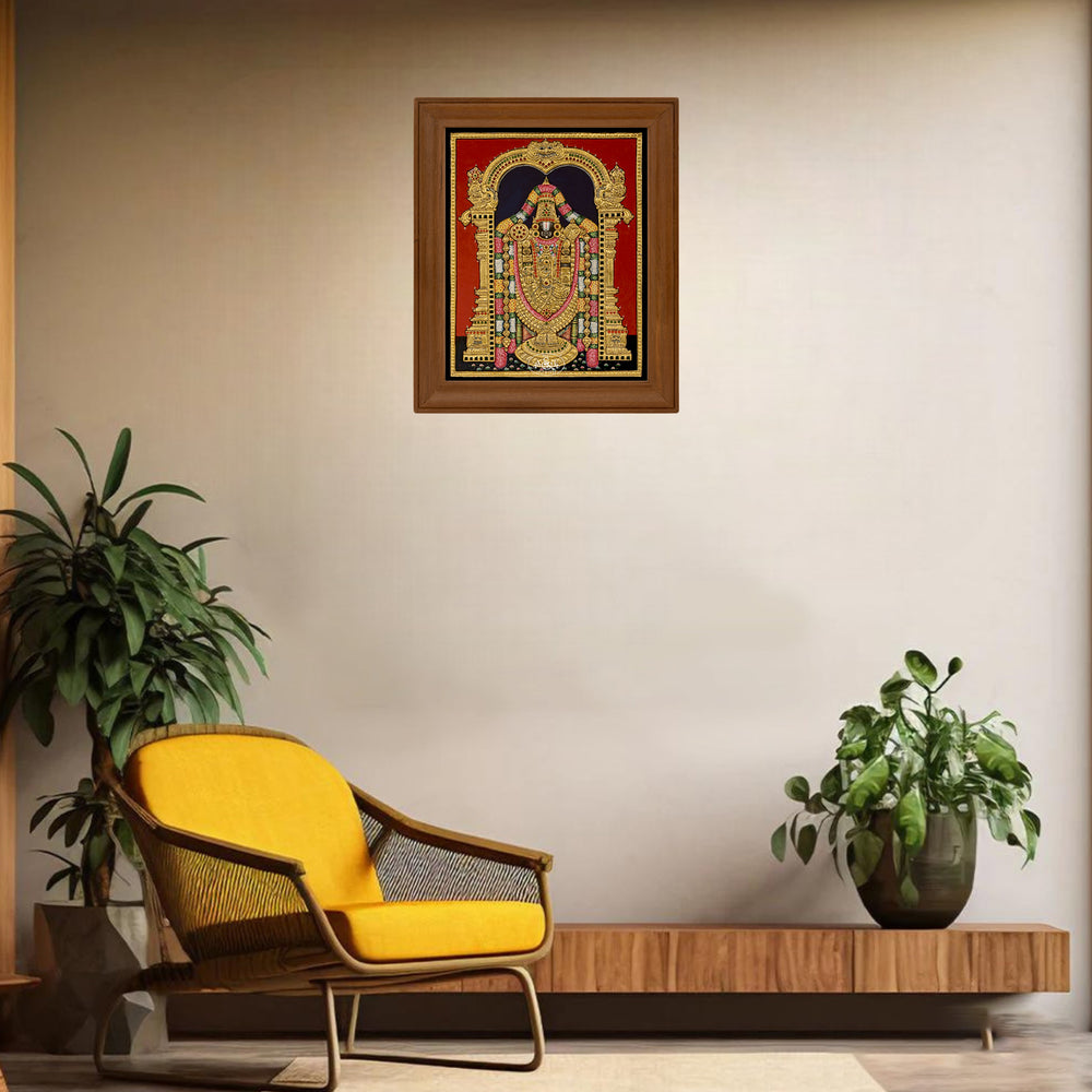 This Tanjore painting features Lord Balaji, a revered form of Lord Vishnu, in all his divine splendor. The painting showcases the deity adorned with rich ornaments, intricate jewelry, and a crown, set against a majestic temple backdrop. The use of 22-karat gold foil enhances the grandeur and radiance of the artwork, making Lord Balaji appear even more divine and powerful. The vibrant red background symbolizes prosperity and devotion, while the intricate details highlight the exceptional craftsmanship of traditional Tanjore art. This painting is perfect for home altars, meditation rooms, or as a centerpiece in living spaces, bringing a sense of peace, protection, and divine blessings to the environment.
