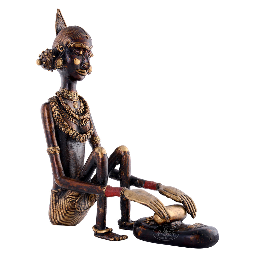 This rare collectible piece of Indian Tribal art depicts a female tribal figurine engaged in the process of pressing and grinding food items in the traditional version of a grinding stone. Tribal Lady (Dokra) Art also known as Dokra art is practiced in India for 4000 years. Dhokra is among the oldest traditional techniques of metal casting. This lovely décor sculpture will illuminate any room, its elegant shape radiates finesse and beauty.this sculpture could transform your living room, bedroom, office into a work of art.