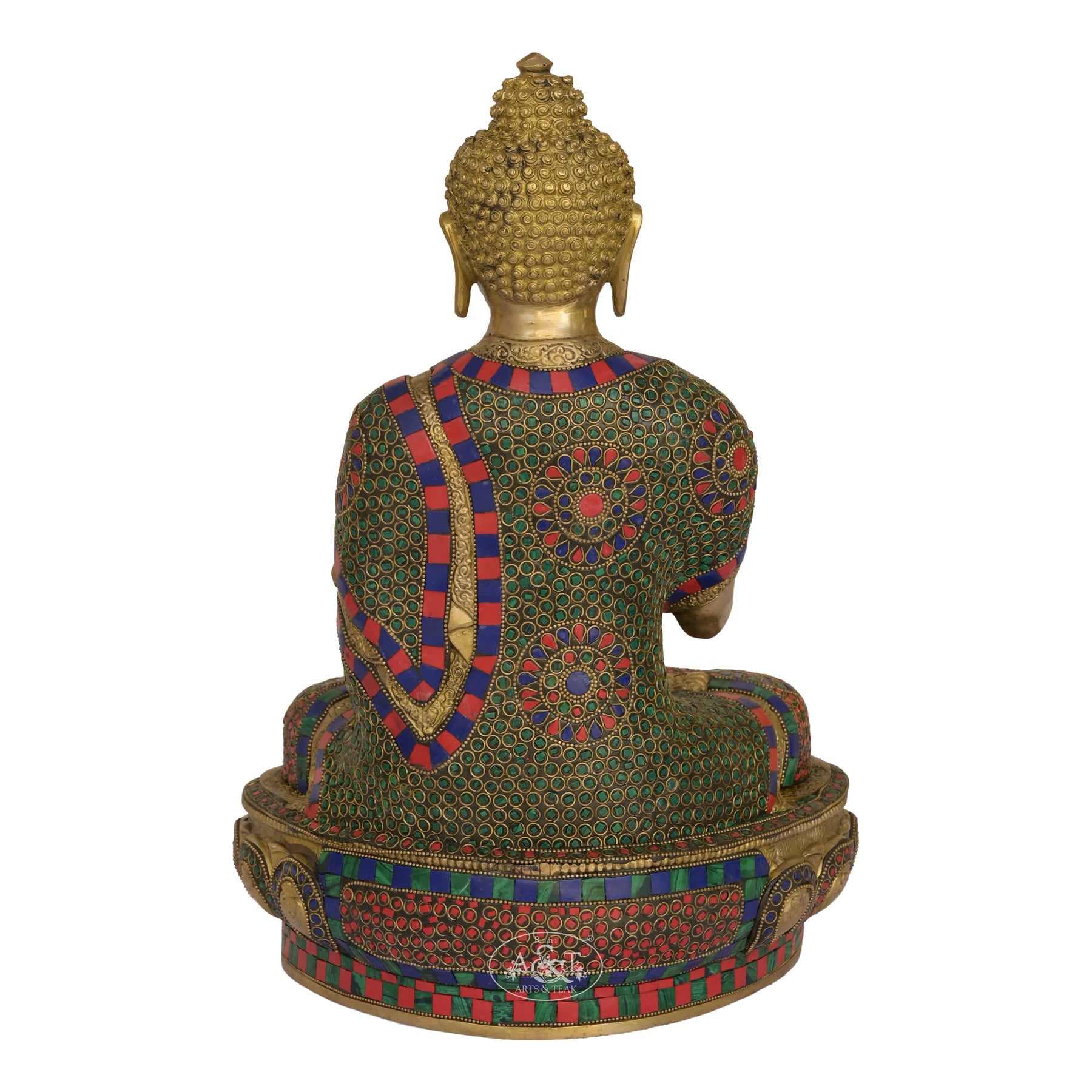 The Medicine Buddha sits in the classic meditation posture, his right hand extended in the gesture of supreme generosity (varada mudra), offering blessings to all who seek healing. His left hand rests in his lap, holding the medicine bowl filled with the nectar of immortality. The vibrant turquoise and coral inlay work adorning his robes represents the precious medicines of the earth - minerals, herbs, and the healing power of nature itself.