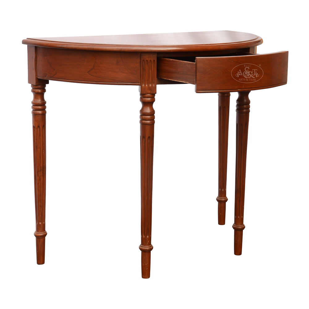 The Teak Wood Demi Lune Console Table is a timeless piece of furniture perfect for any home. This beautiful piece features a demi lune top crafted from solid teak wood, with a smooth finish and an elegant, curved shape . The legs of the table are also made of teak wood, and the table is finished off with a light brown stain. The table is perfect for displaying a centerpiece or decorative items, and it adds a classic touch to any room.
