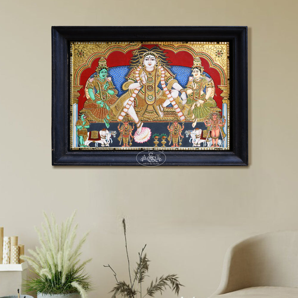 This magnificent Tanjore Painting showcases Dharmasastha alongside the divine figures of Poorna and Pushkala. It is adorned with 22 carat gold leaves. Widely worshipped throughout Tamil Nadu, Lord Sastha is the son of Lord Vishnu (in the form of Mohini) and Lord Shiva, and is often depicted as being married to both Poorna and Pushkala. Ayyappa or Mani Kanda, an incarnation of Lord Sastha, was a Nithya Brahmachari and the adopted son of the Pandya king of Pandalam. However, in the Arayankav temple of Kerala, it is believed that he wedded Pushkala Devi of the Saurashtrian community, and he and his wives Poorna and Pushkala are revered in the Achal Kovil temple of Kerala.
