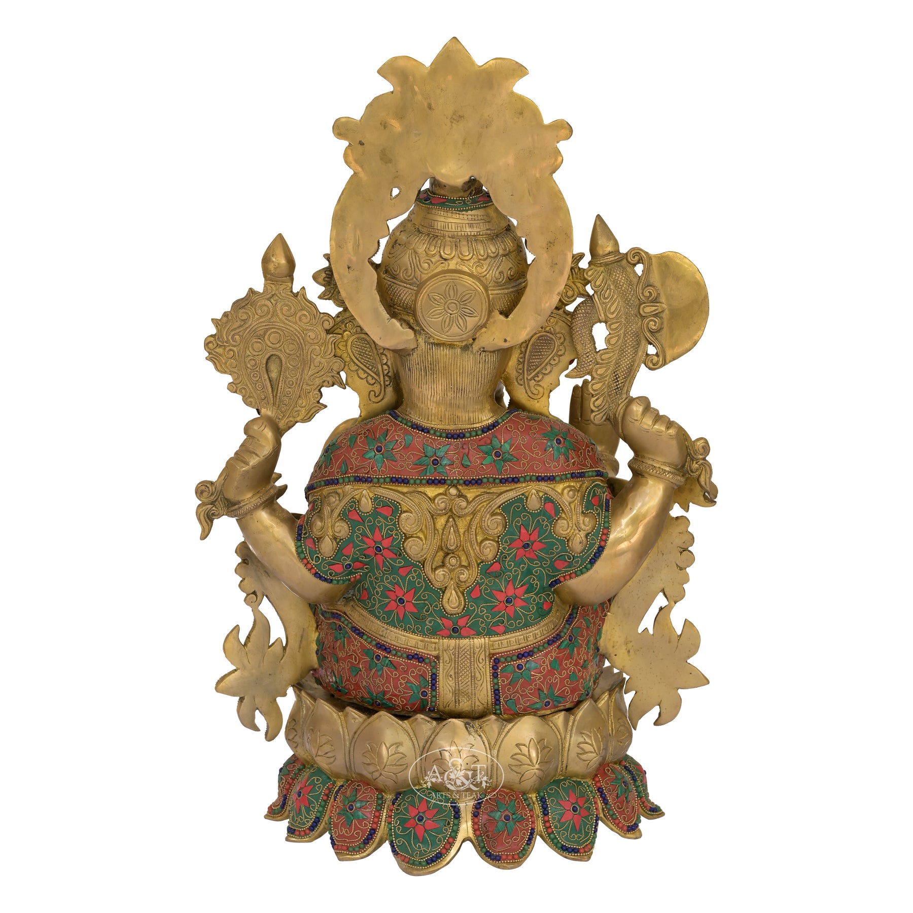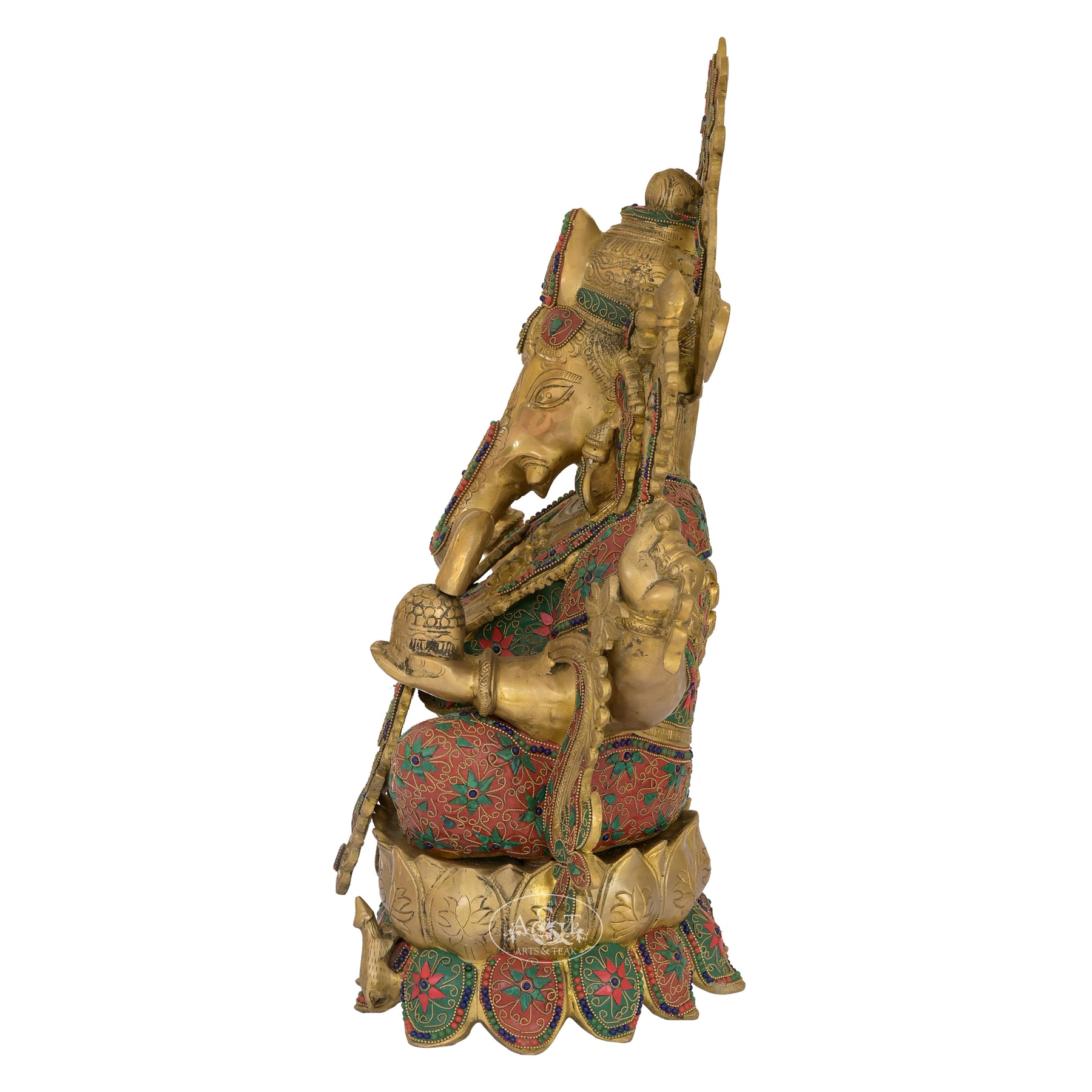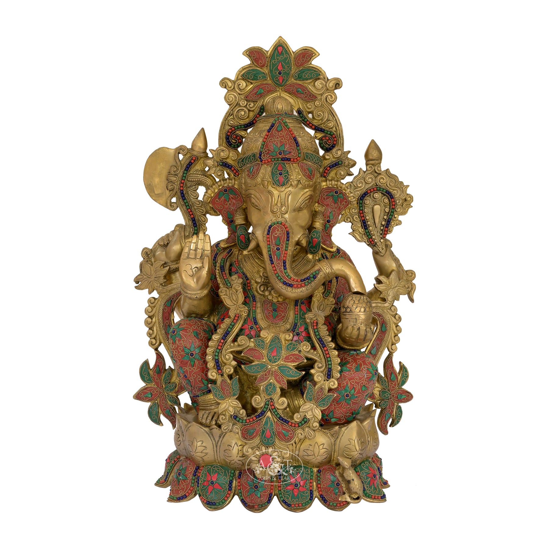 Lord Ganesha seated gracefully on a blooming lotus, symbolizing purity, wisdom, and rising above obstacles. The brass body is richly decorated with red-green meenakari style patterns, giving it a festive and royal character. Each element—from the curled trunk holding a modak to the blessing hand—reflects abundance and divine assurance. The lotus seat adds a sacred elegance, making the idol ideal for spaces seeking prosperity, learning, and positive flow. Overall, it's a visually vibrant piece where craftsmanship meets spiritual symbolism.