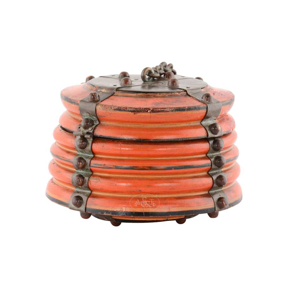 This beautiful collectible is a wooden lacquer box from Malabar region of the erstwhile Kerala. These boxes were used to store small jewelry pieces, trinkets, or precious objects.