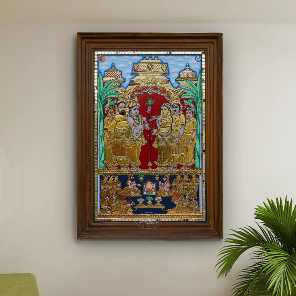 Before the auspicious 'Krishna Marriage' depicted in the painting, a series of captivating events unfold. The daughter of King Bhishmaka, Rukmini was a princess of alluring beauty and later became Krishna's first queen and consort. This exquisitely crafted and adorned masterpiece is sure to captivate and inspire for generations to come.