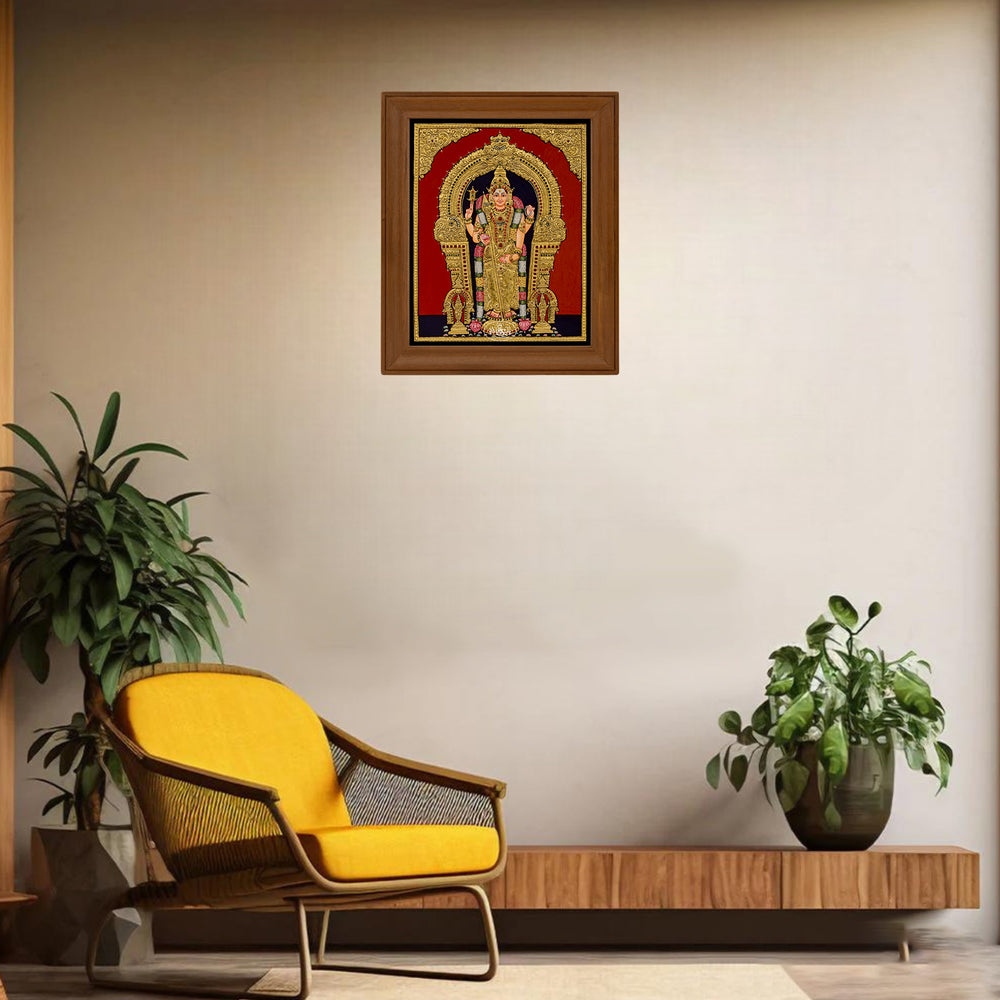 This Tanjore painting features Lord Murugan, the revered deity of courage and wisdom, standing in all his splendor. The artwork is adorned with rich gold foil detailing, highlighting the intricacies of the deity’s ornaments and the elaborate arch that frames him. The deep red background complements the gold, adding a regal aura to the composition. Encased in a traditional wooden frame, this painting is a perfect addition to living rooms, prayer rooms, or offices. It not only enhances the aesthetic appeal of the space but also brings a sense of protection, valor, and spiritual strength.
