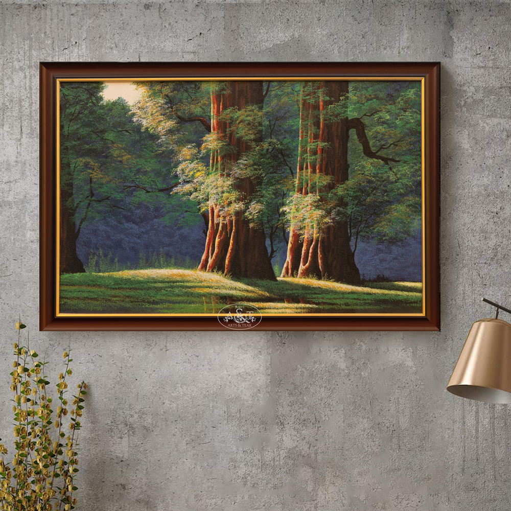 The Serenity Oil Painting on Canvas is a beautiful landscape painting of a peaceful forest. The natural hues and details are skillfully captured on canvas for a stunning addition to any home or office. This expertly crafted piece will be admired for years to come. A timeless piece of art that will add a sophisticated touch of nature to any decor. Hang it anywhere for a captivating centerpiece that will enliven your space with a serene atmosphere.