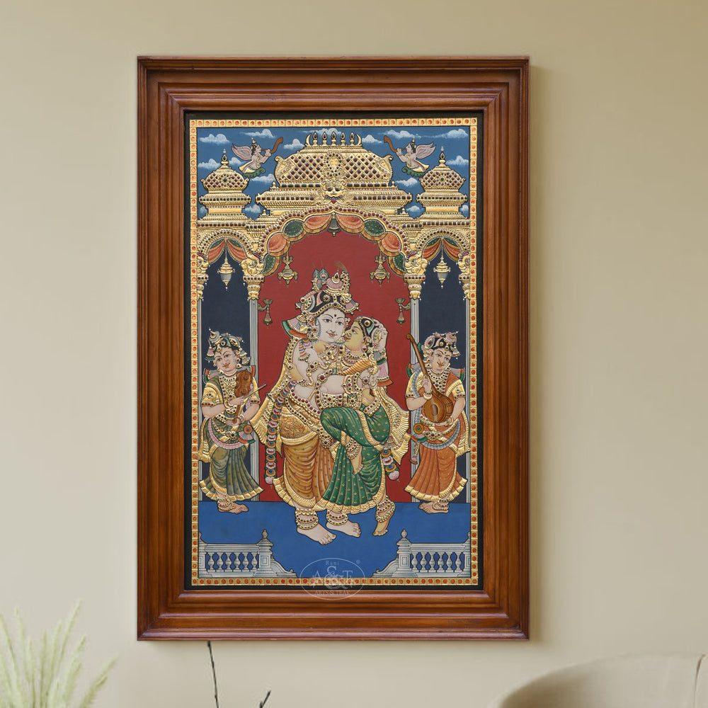 Tanjore paintings are characterized by well-rounded, pristine-looking deities painted in vivid colours. The ornaments, arches and sometimes even the deities are adorned in luxurious gold foil, inlaid with glass beads, and sometimes precious and semi-precious gems. The harmony between classic deep-toned colours and the jewel stones dipping into the lush gold foil, stages a grand ambience in the artworks. Apart from the gold leaf technique, Tanjore paintings are also famous for their unique gesso work. Gesso work is masterfully done to elevate the main characters and bordering arches from the surface, that gives a captivating three-dimensional depth to some Tanjore paintings.