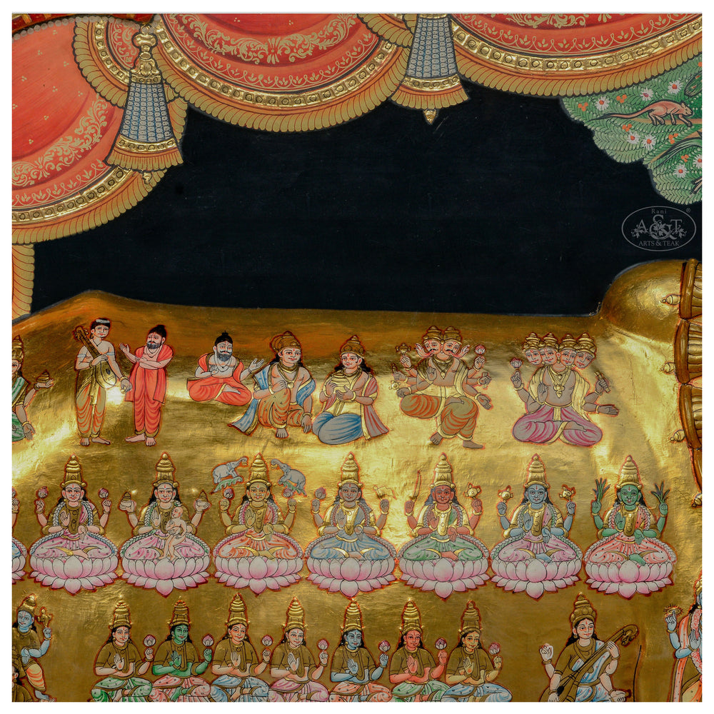 Tanjore (high emboss) Painting to give a 3 dimensional effect with original gold leaf work. Kamdhenu Mata is the cow goddess in which 330 million kinds of Gods stay. Some other names of Goddess Kaamdhenu are Surabhi, Shaval, Aditi and Kamudh. She was one of the nine divine blessings which came out during the Samudra Manthan and was gifted to Rishi Vashisht.