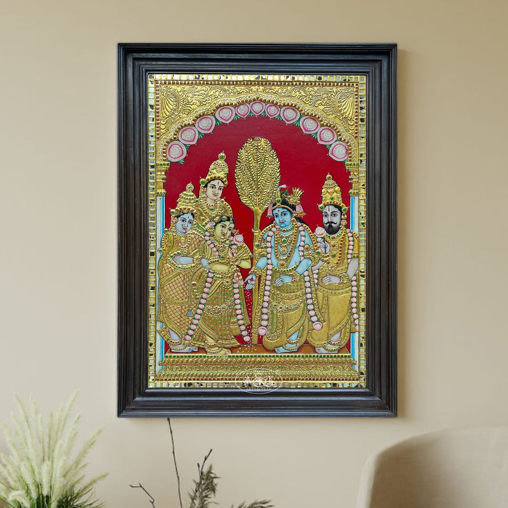 Preceding the auspicious 'Krishna Marriage' in the painting are a series of dramatic occurrences. Rukmini, daughter of Bhishmaka and a princess of captivating beauty, was to become the first consort of Lord Krishna. Splendidly crafted and decorated with delicate accents, this enduring piece of artwork will garner admiration for years to come.
