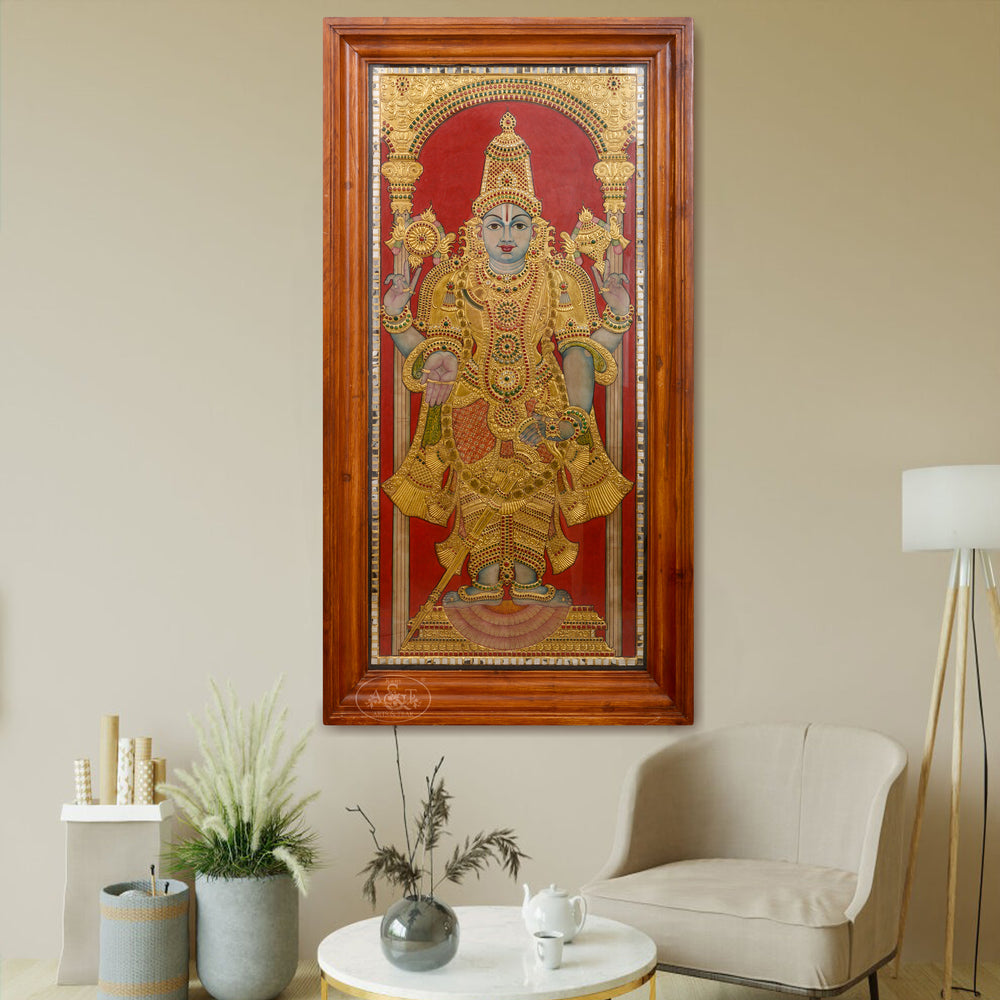 The tradition of Tanjore painting, a classical South Indian painting style, was inaugurated by the town of Thanjavur (also known as Tanjore). It developed during the reign of the Maratha rulers between the 17th and 19th centuries. This Traditional Handmade Srinivasa Tanjore Painting is made with 22 carat gold leaf & semi precious stones.