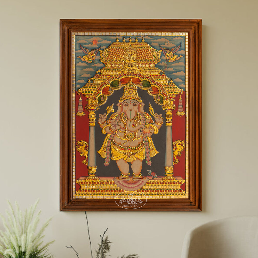 This painting embellished in 22 ct gold leaves depicts Lord Ganesha, also known as Ganapati or Vinayaka, who is one of the best-known and most worshipped deities in the Hindu pantheon. The god of wisdom, success and good fortune, bestower of favors and remover of obstacles, is shown standing Ganesha is holding a noose, an axe, a broken tusk, and a sweet in his hands. The traditional painting of Ganesha can be found in every home, office, temple, and any kind of traditional function. As Ganesha is the god of new beginnings, he is honored at the start of every ritual and ceremony.
