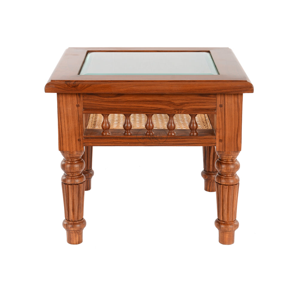 Crafted from Natural Teak wood, our Bed Side Table with Glass fitted on top Tray lends a retro vibe to the bedroom. An angular frame gives it a unique style, while two shelves offer ample storage for books and night time essentials.