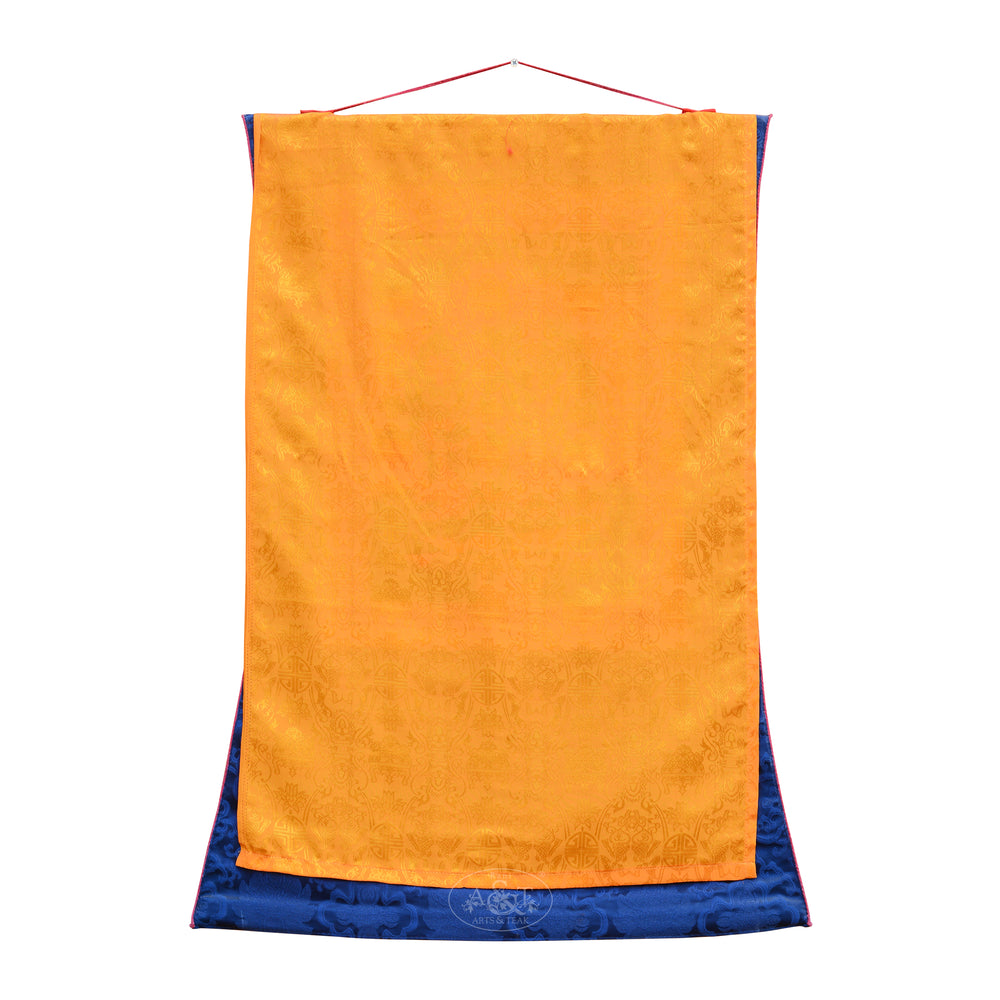 A thangka, variously spelt as thangka, tangka, thanka, or tanka (Nepali pronunciation: [ˈt̪ʰaŋka]; Tibetan: ཐང་ཀ་; Nepal Bhasa: पौभा), is a Tibetan Buddhist painting on cotton, silk appliqué, usually depicting a Buddhist deity, scene, or mandala. Thangkas are traditionally kept unframed and rolled up when not on display, mounted on a textile backing somewhat in the style of Chinese scroll paintings, with a further silk cover on the front. So treated, thangkas can last a long time, but because of their delicate nature, they have to be kept in dry places where moisture will not affect the quality of the silk. Most thangkas are relatively small, comparable in size to a Western half-length portrait, but some are extremely large, several metres in each dimension; these were designed to be displayed, typically for very brief periods on a monastery wall, as part of religious festivals. Most thangkas were intended for personal meditation or instruction of monastic students. They often have elaborate compositions including many very small figures. A central deity is often surrounded by other identified figures in a symmetrical composition. Narrative scenes are less common, but do appear.