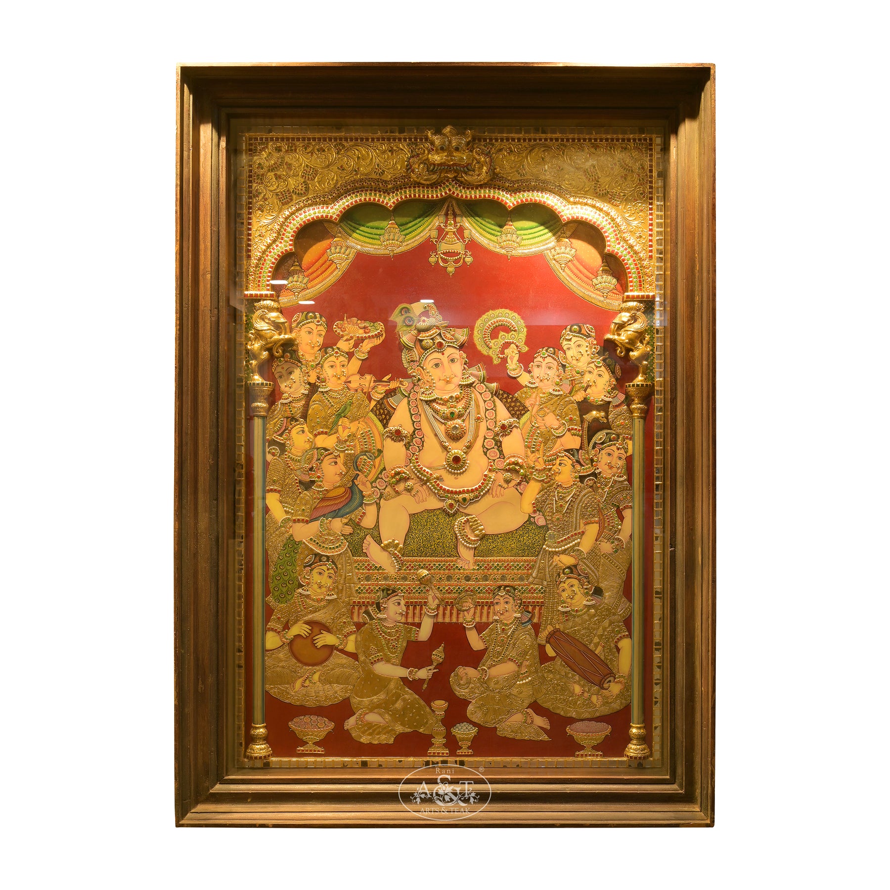 Tanjore paintings, dating back to the 17th century in Tanjore, Tamil Nadu, embody a distinguished South Indian artistic tradition. Celebrated for their rich colors and elegant, minimalistic compositions, these masterpieces showcase gleaming gold leaf layered atop detailed gesso work, frequently adorned with glass beads and occasionally with precious or semi-precious stones. They portray enduring themes focused on revered deities and sacred figures.