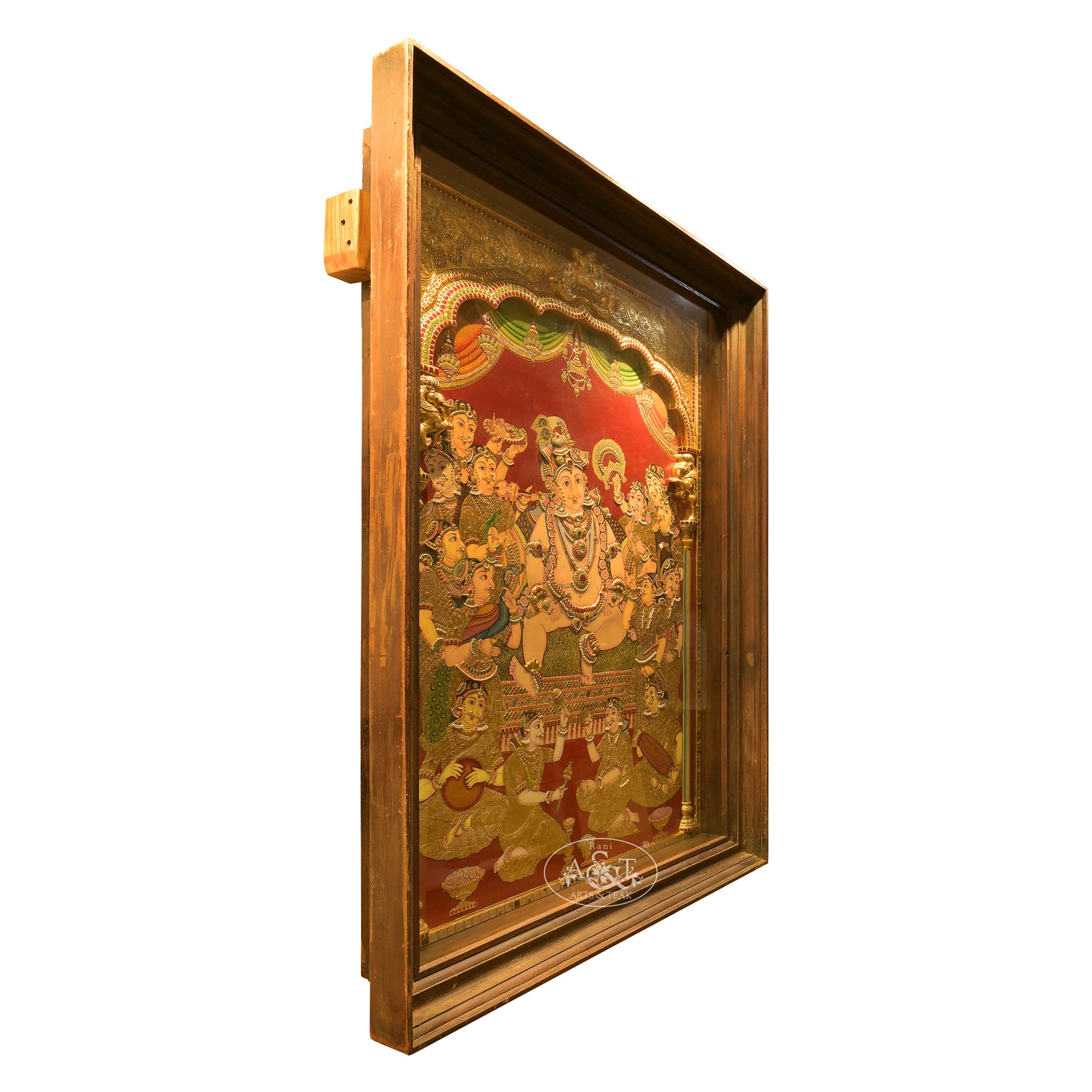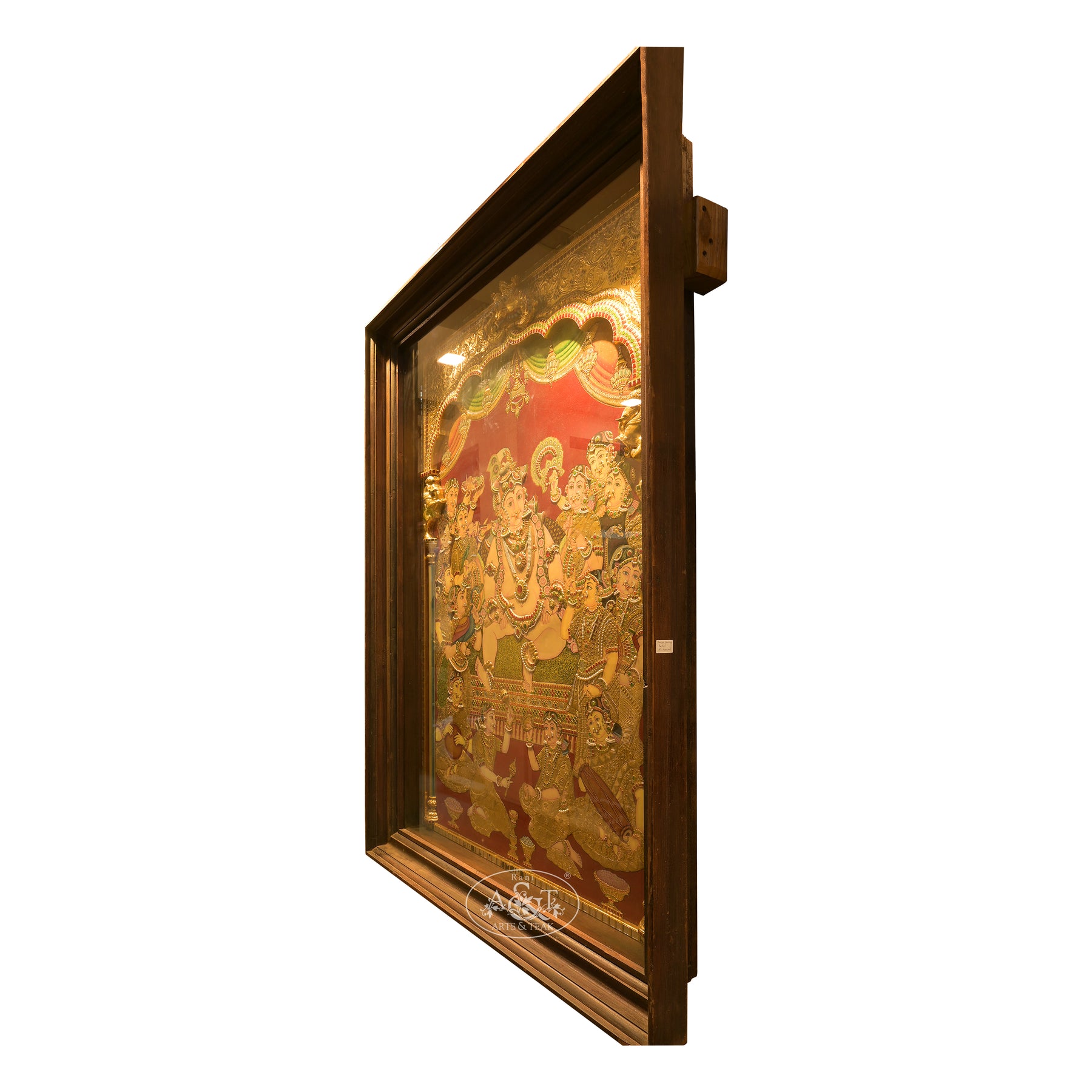 This artwork honors the captivating essence of divine love expressed through music. It portrays Lord Krishna seated gracefully on a platform, surrounded by elegant women playing musical instruments. The embossed detailing adds a refined texture to the composition.
