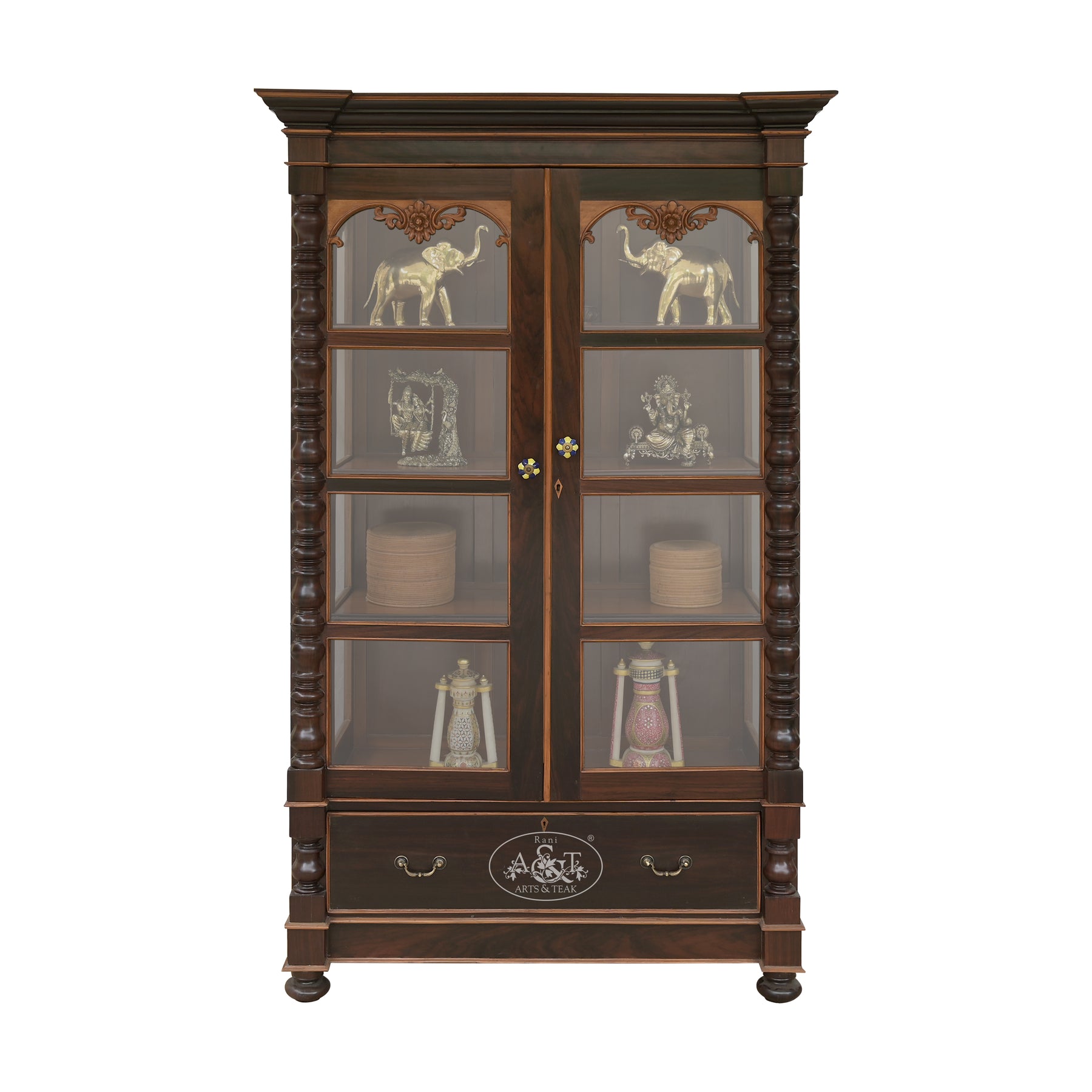 Wooden display cabinet with glass doors featuring elephant designs on a white background