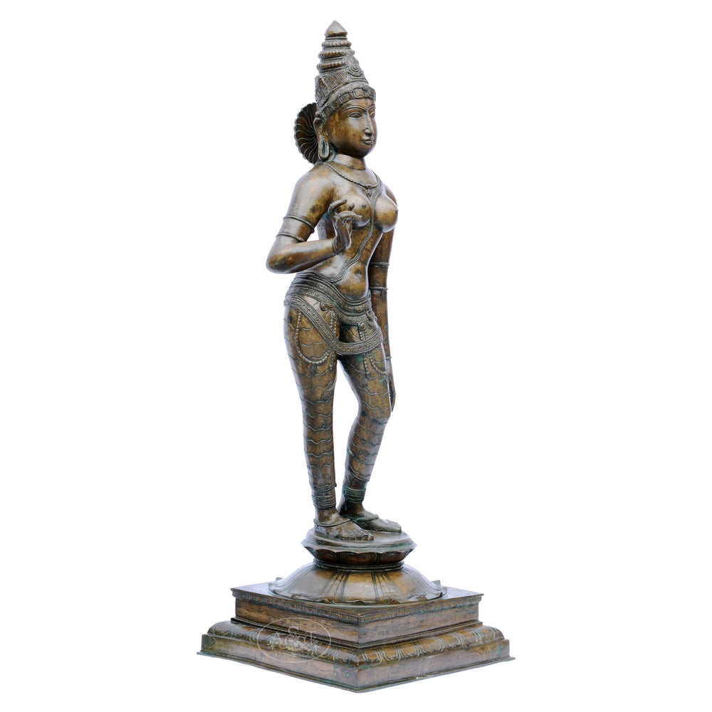Sivagami is a form of goddess Parvati, the consort of Shiva, and the ultimate representation of love, fertility and devotion. Crafted in the graceful and elegant style of the Chola period, this bronze sculpture of Sivagami focuses on her mudras, which are believed to show fearlessness and devotion.
